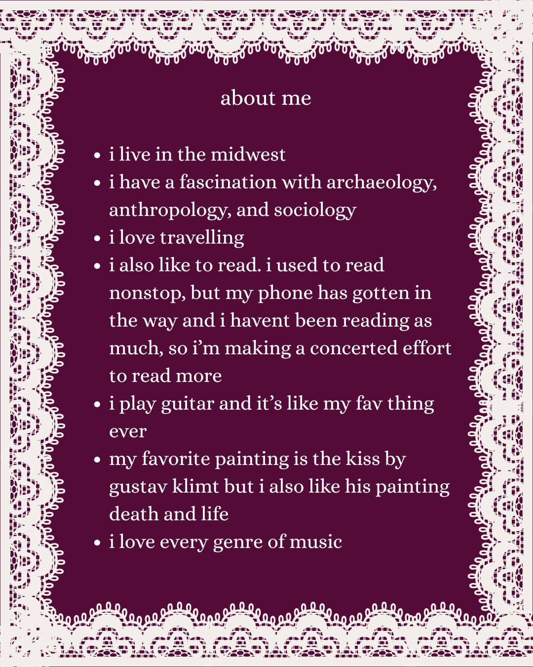 this is essentially my diary, but for some illogical reason i decided i wanted anybody on the face of this earth to be able to access my personal thoughts at any time they wish. i’m a digital footprints nightmare and a stalker’s dream. not funny. don’t stalk me please. and don’t worry, i will capitalize my words in my blogs, i just like how this looks here. my goal with this it to have a space to process life as it happens to me, share my unsolicited perspectives and opinions, and remind you that you are not alone in any feeling, no matter how strange.